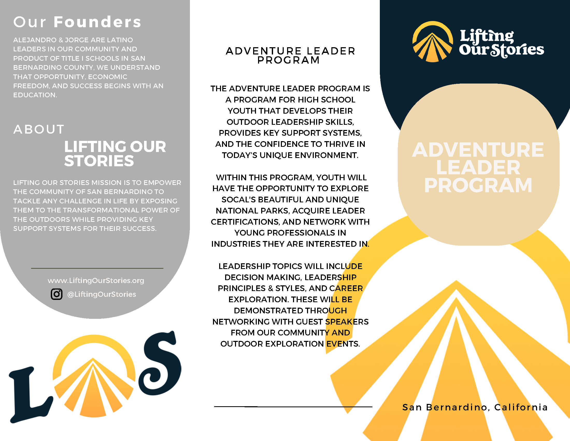 Lifting our stories (L.O.S.) is bringing an all-new EXPERIENTIAL program for HIGH SCHOOL students to learn both leadership and technical skills in both classroom sessions and on outdoor trips.